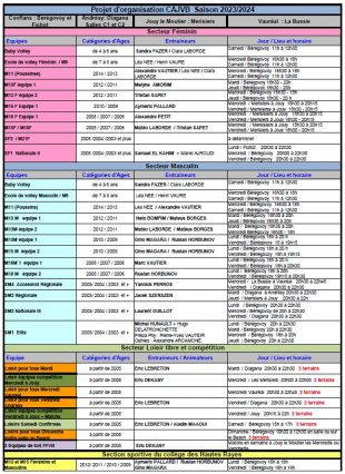 L’organisation des créneaux pour parvenir à planifier la pratique de plus de 400 licenciés n’est pas chose aisée mais elle commence à prendre tournure. Voici le dernier jet du projet d’organisation avec les contraintes suivantes : catégories …
