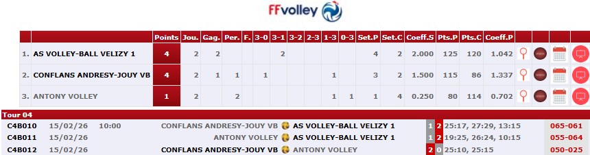 Les seniors masculins 4 Accession Régionale ce dimanche 15 février 2026 à Andrésy se sont imposés 3 sets à 2 contre CARRIERES SUR SEINE 2 ( 27/25, 22/25, 26/24, 27/29,15/09)