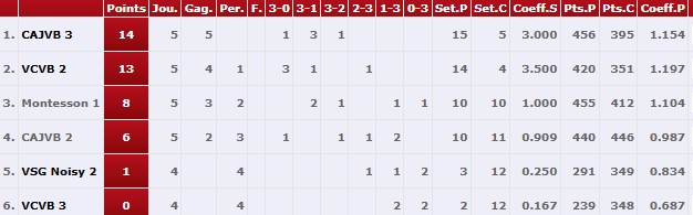 Dans cette poule constituée à partir des équipes classée en poule basse la saison dernière, le CAJVB 3 termine la première phase avec un bilan de 5 victoires et prend la première place au classement.