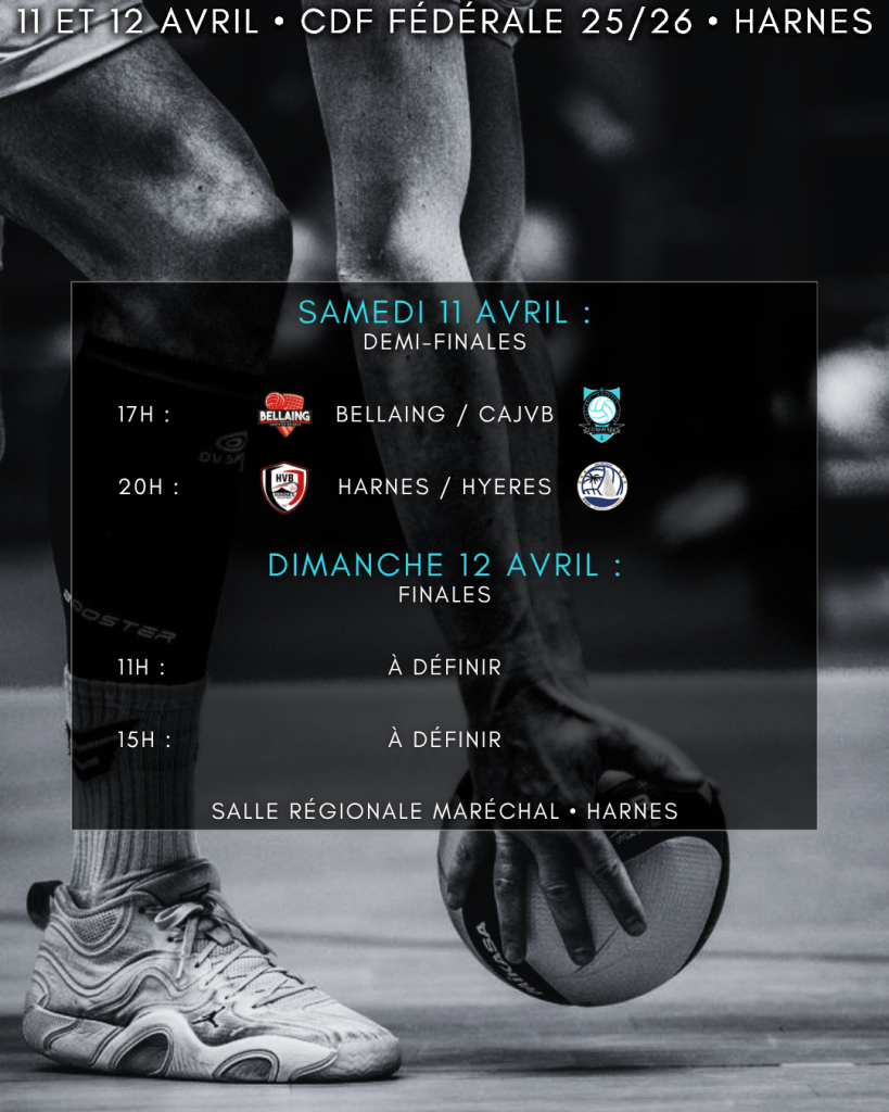 Samedi prochain, le CAJVB se rend à HARNES pour disputer à 17h sa demi-finale contre BELLAING avec la volonté de se qualifier pour la finale du lendemain à 15h contre le vainqueur du match HARNES / HYERES. Sinon ce sera la place de 3 à 4 à 11h, une rencontre qui aura toutefois de l’enjeu puisque les 3 premiers pourraient jouer le premier tour de la Coupe de France professionnelle la saison prochaine en cas d’accession de HARNES en Pro B.