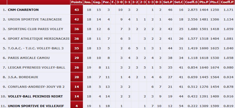 - Grâce à leur victoire face à BORDEAUX 3 sets à 0, nos masculins Nationale 2 conservent leurs chances de maintien à ce niveau.